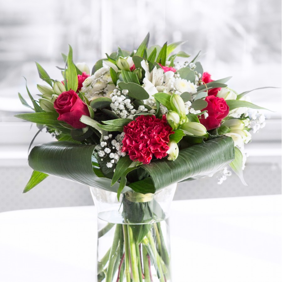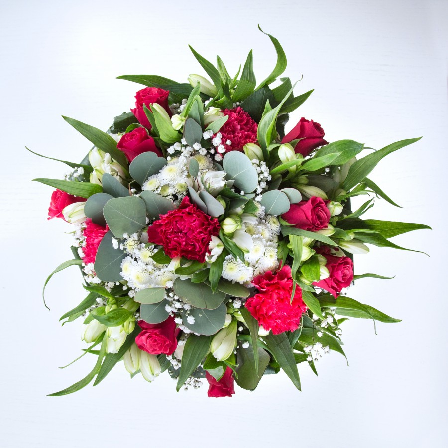 Step into a lush garden of delight with our Vibrant Garden Elegance bouquet. This striking arrangement marries the subtle charm of mini white chrysanthemums and airy gypsophila with the bold sophistication of red roses and carnations. Enhanced with fresh white alstroemeria and graceful aspidistra leaves, every bloom is hand-selected for peak freshness and outstanding beauty.